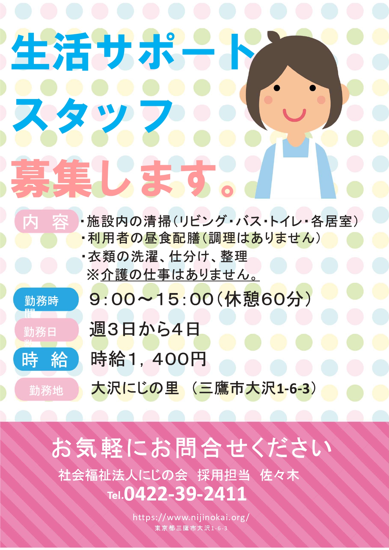 この度、にじの会職員(日中支援スタッフ)の働き方を13分程度の動画にまとめました。視聴ご希望の方は、下記担当者までメールでお問い合わせ下さい。採用担当から動画視聴の手続きをご案内させて頂きます。