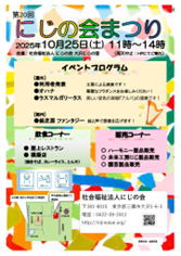 第20回にじの会まつりを開催いたします。 にじの会の活動や商品を紹介させていただく機会でございますので、ご来場を心よりお待ちしています。 ● 日時: 2025年10月25日(土) 11時~14時 (雨天中止:HPにてご案内致します) ※当日は新型コロナ感染対策を実施しますので、マスク着用、手指消毒等のご協力をお願い致します。